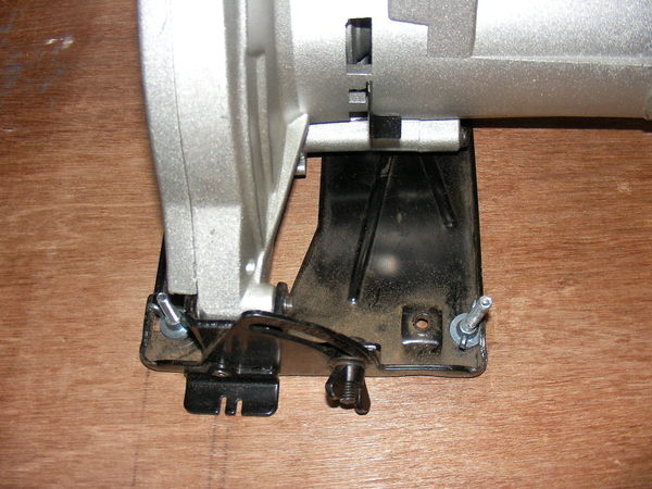 切出鋸片的出口,木板上鑽了5個洞,下方鋼片的也磨了5個缺口,鎖上螺絲,裝上圓鋸,調整鋸片的角度與導板平行(花了不少時間在調整上面,前後拆裝了好幾遍)