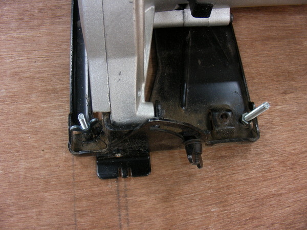 這台圓鋸機是手提式了,要改成倒吊式的,必須在板子上鑽洞,可是要在鋼板上鑽洞實在困難,又沒有工具,最後就只好使用砂輪機,從側邊磨掉。在鎖上螺絲,光弄這個就弄了好久。