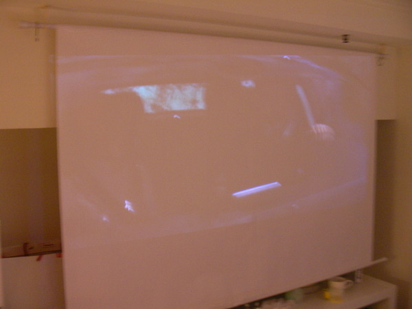 家中的投影機想從客廳移到二樓和室,沒有足夠的牆面可以投射,原本的移動式氣壓布幕也不合用,所以就自製了這個螢幕。 使用全開的白紙兩張貼合,上下使用伸縮窗簾桿撐住,再用掛勾掛起來。 長約160公分 寬約100公分 // <![CDATA[ <br> // ]]> 家中的投影機想從客廳移到二樓和室,沒有足夠的牆面可以投射,原本的移動式氣壓布幕也不合用,所以就自製了這個螢幕。 使用全開的白紙兩張貼合,上下使用伸縮窗簾桿撐住,再用掛勾掛起來。 長約160公分 寬約100公分 // <![CDATA[ <br> // ]]>
